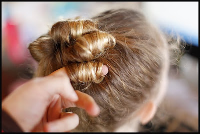 Anyway once you've got your pony, take a small section of hair - you can experiment with how much you use depending on the length of hair - Hettie's hair is quite long now and this amount made nice big fat curls. Lots of little ones would also look fab.